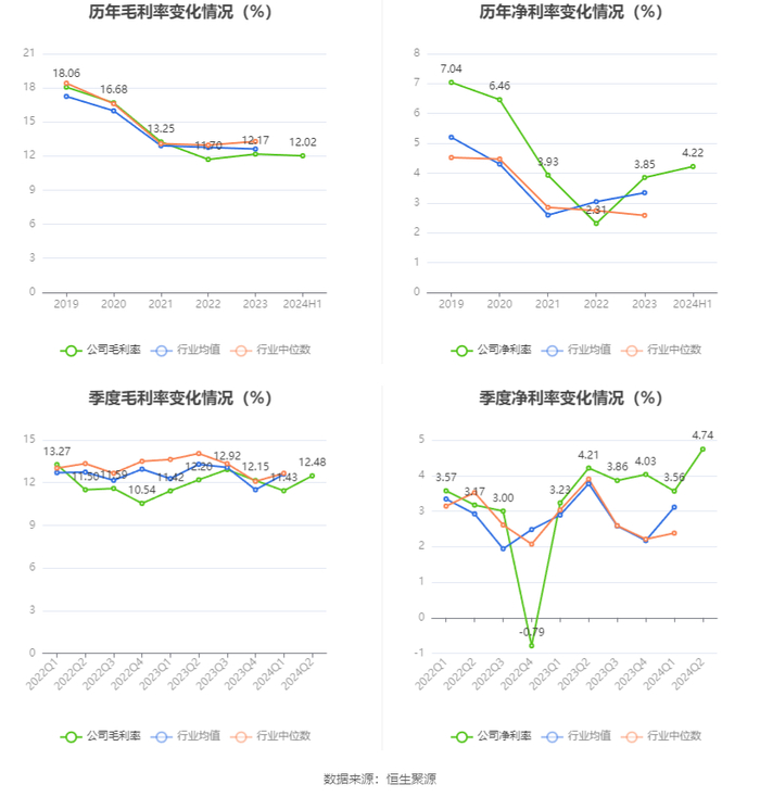 2024年上半年,公司毛利率为12.02%,同比上升0.17个百分点;净利率为4.22%,较上年同期上升0.44个百分点。从单季度指标来看,2024年第二季度公司毛利率为12.48%,同比上升0.28个百分点,环比上升1.05个百分点;净利率为4.74%,较上年同期上升0.53个百分点,较上一季度上升1.18个百分点。