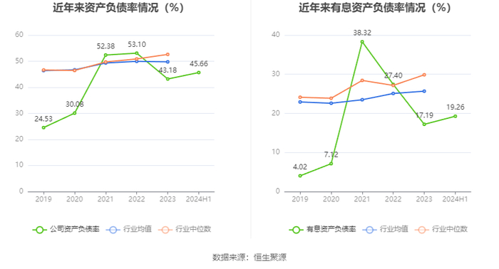 在偿债能力方面,公司2024年上半年末资产负债率为45.66%,相比上年末上升2.48个百分点;有息资产负债率为19.26%,相比上年末上升2.07个百分点。