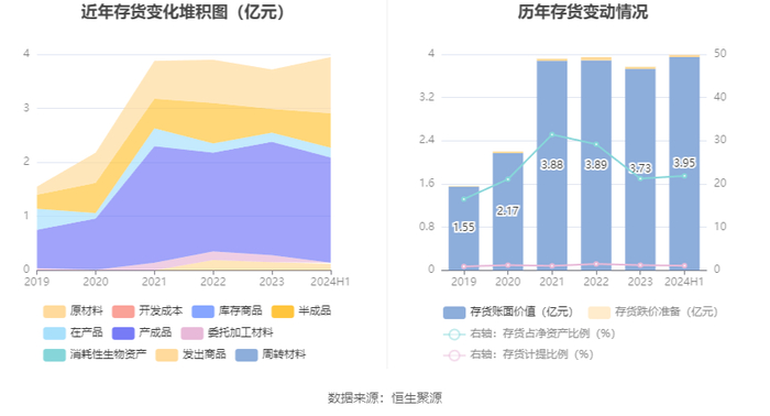从存货变动来看,截至2024年上半年末,公司存货账面价值为3.95亿元,占净资产的21.86%,较上年末增加2250.64万元。其中,存货跌价准备为428.27万元,计提比例为1.07%。