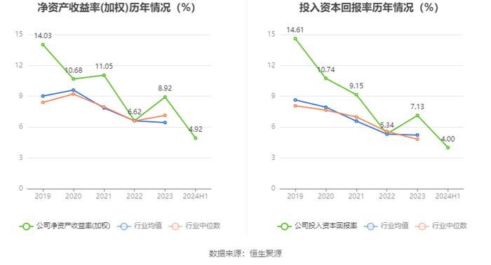 数据显示,2024年上半年公司加权平均净资产收益率为4.92%,较上年同期下降0.58个百分点;公司2024年上半年投入资本回报率为4.00%,较上年同期增长0.23个百分点。