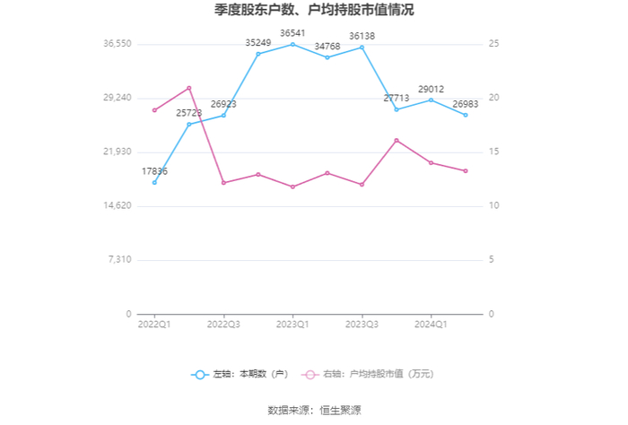 筹码集中度方面,截至2024年上半年末,公司股东总户数为2.7万户,较一季度末下降了2029户,降幅6.99%;户均持股市值由一季度末的14.03万元下降至13.28万元,降幅为5.35%。
