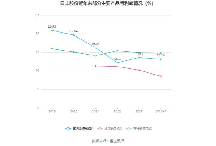 分产品看,空调连接线组件、通信装备组件、特种装备电缆2024年上半年毛利率分别为13.16%、8.54%、14.78%。