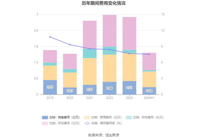 2024年上半年,公司期间费用为1.57亿元,较上年同期增加962.68万元;期间费用率为7.56%,较上年同期上升0.21个百分点。其中,销售费用同比增长18.77%,管理费用同比增长12.59%,研发费用同比增长3.92%,财务费用同比下降45.71%。