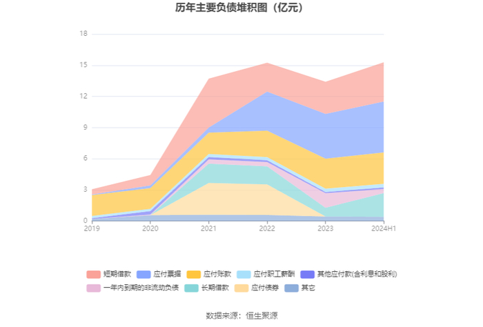 负债重大变化方面,截至2024年上半年末,公司长期借款较上年末增加172.70%,占公司总资产比重上升4.14个百分点;一年内到期的非流动负债较上年末减少72.31%,占公司总资产比重下降3.34个百分点;短期借款较上年末增加21.42%,占公司总资产比重上升1.27个百分点;应付票据较上年末增加13.90%,占公司总资产比重上升0.80个百分点。