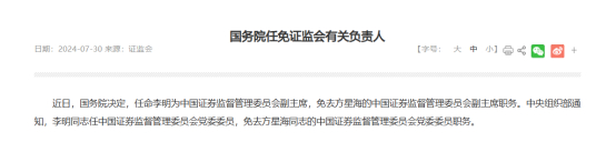 证监会迎来新副主席。7月30日,据证监会官网消息,近日,国务院决定,任命李明为证监会副主席,免去方星海副主席职务。中央组织部通知,李明同志任证监会党委委员,免去方星海同志的党委委员职务。目前证监会官网已更新了相应变动。