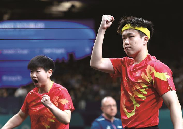 新华社巴黎7月30日电(记者何磊静 岳冉冉 王昀加)30日,南巴黎竞技场4号馆里一片“红色海洋”。头号种子王楚钦/孙颖莎4:2战胜朝鲜组合李正植/金琴英,拿下乒乓球混双项目金牌,这是中国乒乓球队在巴黎奥运会上的首枚金牌,更是国乒历史上首枚混双奥运金牌。