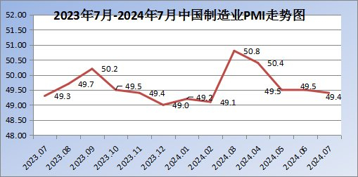 中国物流与采购联合会、国家统计局服务业调查中心发布的2024年7月份中国制造业采购经理指数(PMI)为49.4%,比上月下降0.1个百分点。