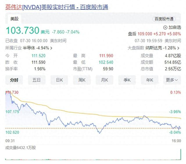 跌落神坛!英伟达市值一夜蒸发1.4万亿元 ZOL中关村在线 中关村在线官方账号 2024.07.3110:27 关注 据媒体报道,周二美股收盘,英伟达报103.73美元,跌7.04%,市值2.6万亿美元,创5月底以来收盘新低。其市值一夜蒸发1934亿美元(约合人民币14024亿元)。(8883701)