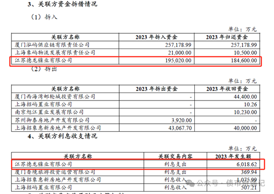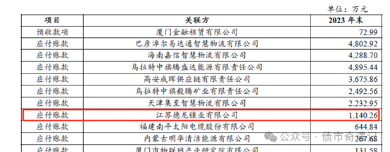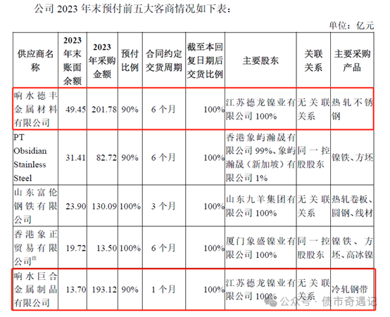 除了厦门象屿涉及的应收账款和预付款项外,象屿集团也与江苏德龙系有一定规模的交易,在象屿集团的债券募集说明书中,将江苏德龙镍业列为其他关联方(重要子公司的少数股东),2023年自江苏德龙镍业采购金额812.74万元,应付账款有含应付江苏德龙镍业1140.26万元,其他应付款中应付江苏德龙镍业11794.31万元。另,象屿集团2023年自江苏德龙镍业拆借资金19.50亿元,归还资金18.46亿元,产生利息支出6018.62万元。和厦门象屿的交易金额相比,象屿集团涉及的规模就显得偏小了,而且是占用江苏德龙系资金的一方。