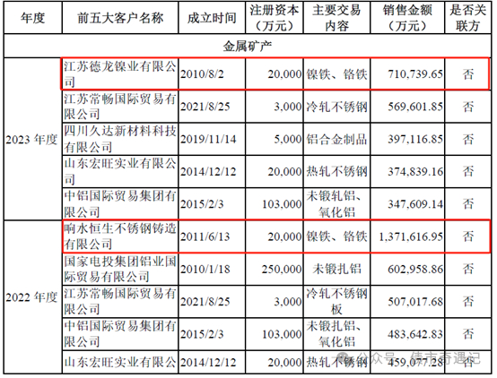 厦门象屿曾在7月11日发布关于对上海证券交易所年报监管工作函的回复公告,里面提到2023年向江苏德龙镍业有限公司的销售金额71.09亿元(占当年营业收入的比重1.55%),2022年向响水恒生不锈钢铸造有限公司销售金额137.16亿元(占当年营业收入的比重2.55%)。从收入的占比来看,并不高。但由此产生的应收账款有多大?厦门象屿在年报中并未披露应收账款(2024年3月末应收账款为194.17亿元)的应收对象名称,但作为销售金额最大的客户,规模应该不小。