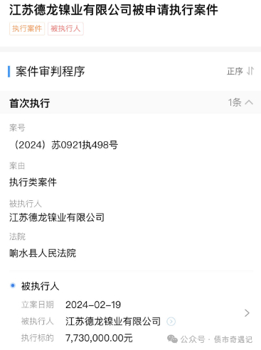 江苏德龙系的风险爆发也有其他迹象,根据企业预警通,江苏德龙镍业在2024年2月就已被响水县人民法院列为被执行人。