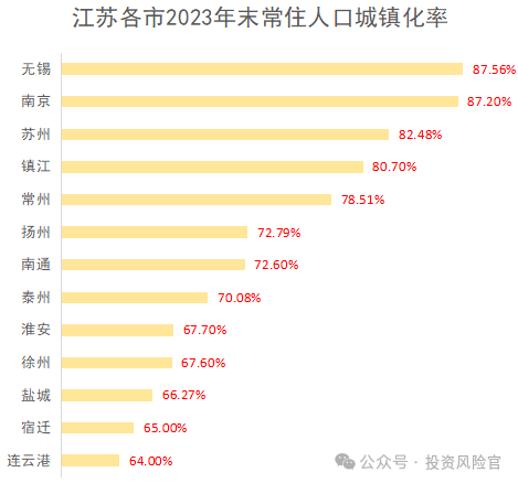 13个设区的市2023年末常住人口城镇化率均超过60%。其中无锡最高,达到87.56%;南京为87.20%;另有苏州和镇江2市2023年末常住人口城镇化率也超过80%。