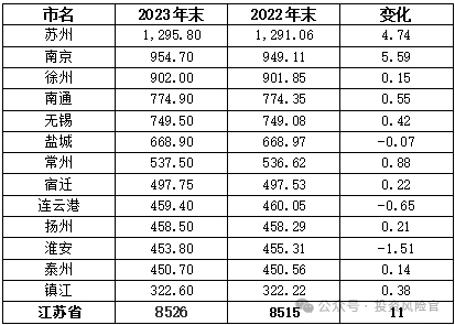 2022年-2023年末江苏省13市常住人口如下表(单位:万人):