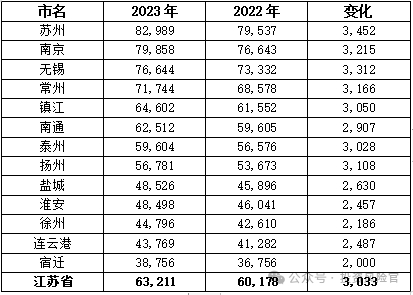 农村居民情况方面,苏州2023年农村居民人均可支配收入为46385元,又在全省排第一,另有无锡和常州农村人均可支配收入也超过4万元,并排在省会南京前。