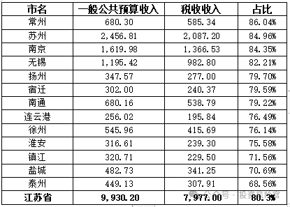 常州税收收入占比最高,达到86.04%;苏州、南京和无锡占比也超过80%。