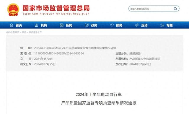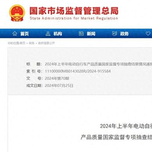 新华网北京7月30日电(记者索炜)近日,市场监管总局通报了2024年上半年电动自行车产品质量国家监督专项抽查结果,共发现146批次电动自行车不合格,涉及九号、绿源、爱玛、雅迪、小牛等多个品牌;共发现79批次电动自行车充电电池不合格,主要涉及酸蓄电池和锂离子蓄电池2个品类。