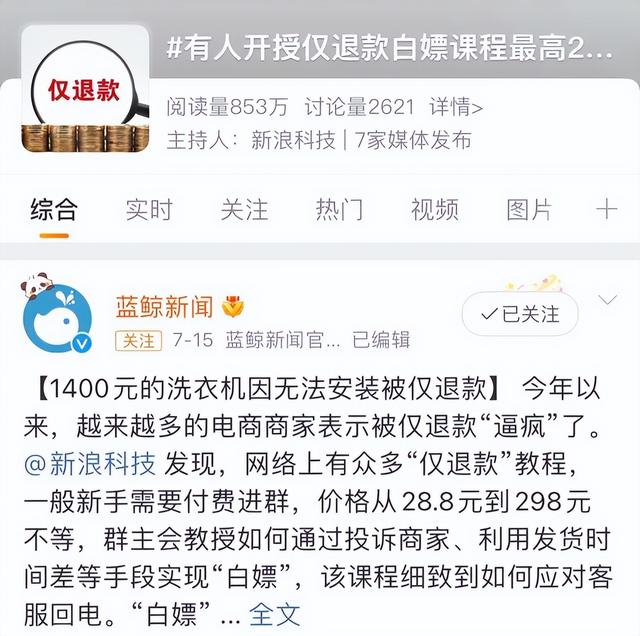 不过,今年以来,涉及到“仅退款”关键词的消息频频登上热搜,网上甚至出现了众多相关教程,新手付费进群后学习通过投诉商家、利用发货时间差等手段实现“白嫖”,课程详细到应对客服回电的方法等。