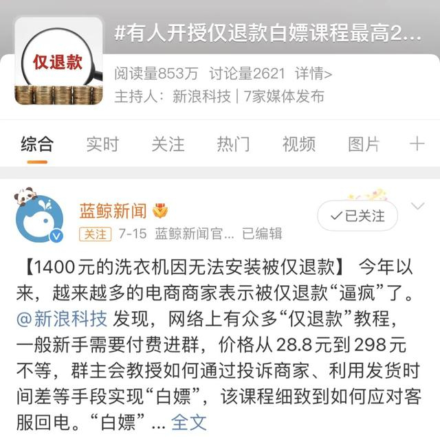 不过,今年以来,涉及到“仅退款”关键词的消息频频登上热搜,网上甚至出现了众多相关教程,新手付费进群后学习通过投诉商家、利用发货时间差等手段实现“白嫖”,课程详细到应对客服回电的方法等。