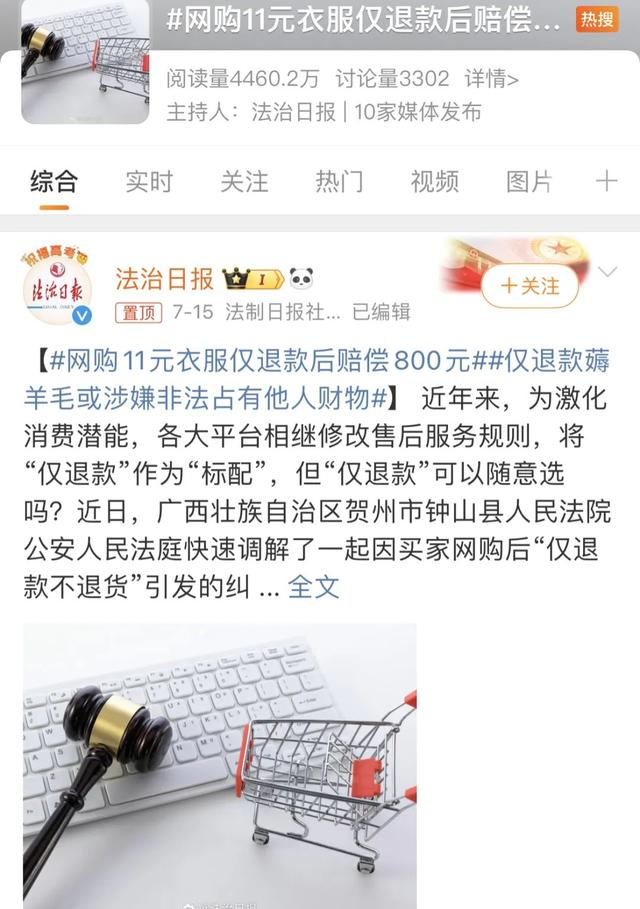 同样在今年4月,有用户在电商平台花11.96元购买衣服,收到货物后因对货物不满意,申请“仅退款”,店铺客服解释“衣物是正常的尺码,不满意可以申请退货退款”,双方沟通未果,电商平台做了“仅退款”处理。最终,店铺店主将消费者告上了法庭,法院最后判令消费者退还货款以及因此次维权产生的800元合理费用。