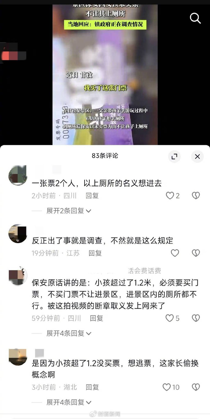视频发出后,引发了众多网友关注及讨论。有网友认为,既然小女孩已经超过1.2米需要购买门票,就应该买票后进入景区上厕所,保安也是按景区管理制度办事;但也有网友认为,景点应体现人文关怀进行人性化灵活处理,可以先让小女孩上厕所再补票。