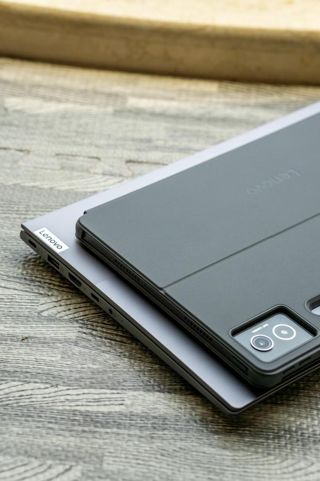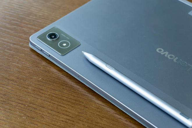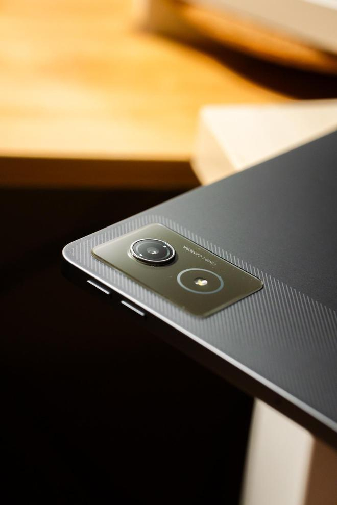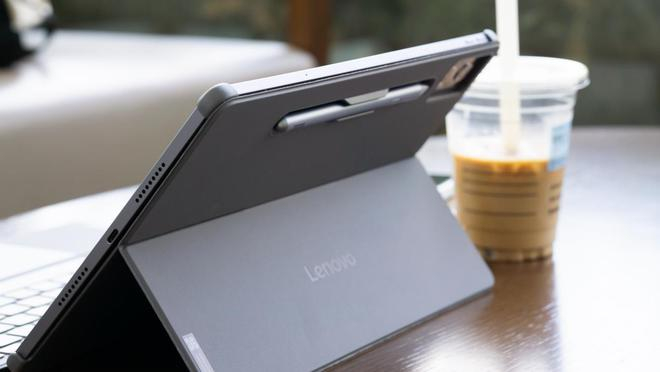 背部的摄像头 Deco 有些空旷,只有一个镜头和闪光灯,这可以说是联想的家族设计了,比起用多个廉价镜头凑数,这样的设计也确实更加合理好看。同时我还注意到背部靠上有一排斜纹装饰,这边有手写笔的磁吸位置,尝试了一下吸力也很不错,不过毕竟是在背部,没有安装保护壳的情况下还是相对容易脱落的。所以我建议家友们如果对这类背吸的平板有兴趣,还是同步购买配套保护壳吧。