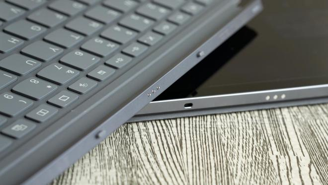 底部则是磁吸金属触点和用来帮助稳定键盘的卡口,吸力牢靠,即使单手拎着键盘甩动也很难脱落。