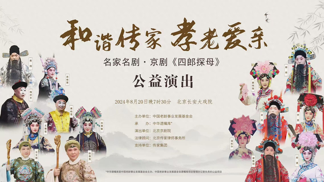 “和谐传家 孝老爱亲”自古以来就是中华民族优秀传统文化中的道德典范。为传承中华优秀传统文化和优良道德传统,中国老龄事业发展基金会与北京京剧院将于2024年8月20日晚在长安大戏院举办“和谐传家 孝老爱亲”名家名剧公益演出,特邀老中青三代艺术家合作演出京剧《四郎探母》。