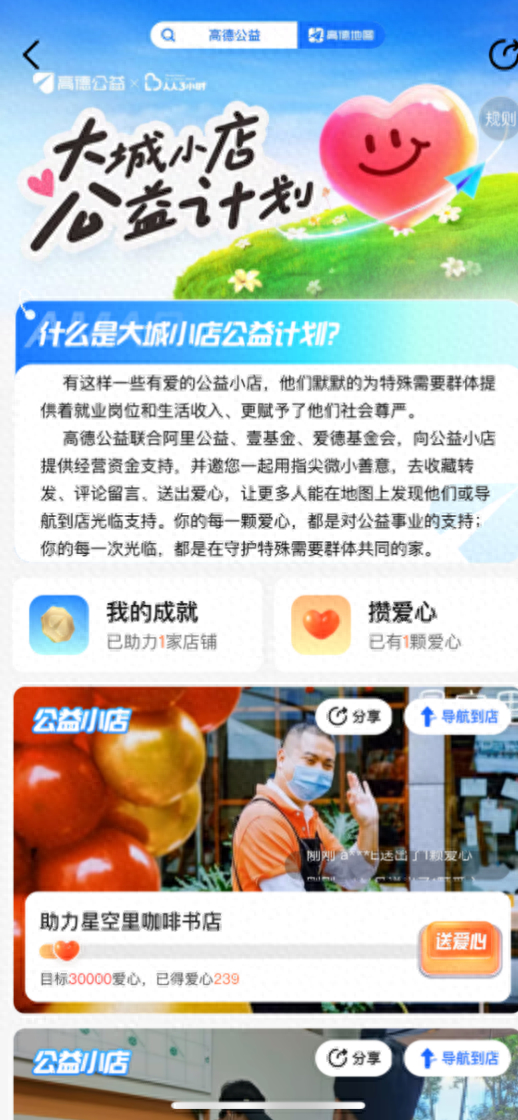 为了鼓励社会大众的积极参与,高德地图特别设计了公益互动界面。用户只需搜索“高德公益”,即可进入专属页面,通过点赞、收藏、分享或评论等方式,为喜爱的公益小店累积“爱心值”。这些举措将帮助店铺解锁更多扶持资源,形成良性循环,共同推动公益事业的发展。