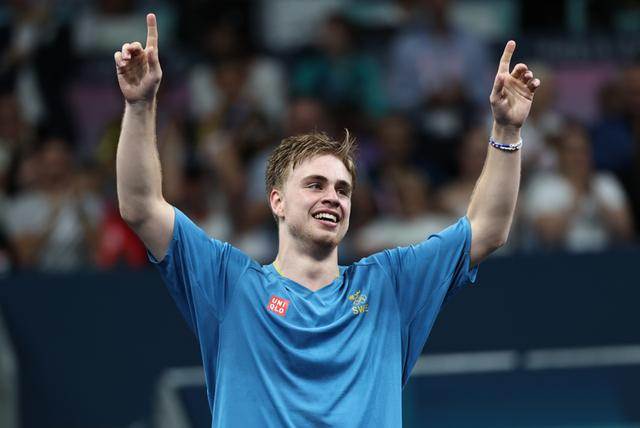 新华社照片,巴黎,2024年7月31日 7月31日,特鲁斯·莫雷加德在获胜后庆祝。在巴黎奥运会乒乓球男子单打32强赛中,瑞典选手特鲁斯·莫雷加德4比2战胜中国选手王楚钦,晋级16强。 新华社记者 王东震 摄