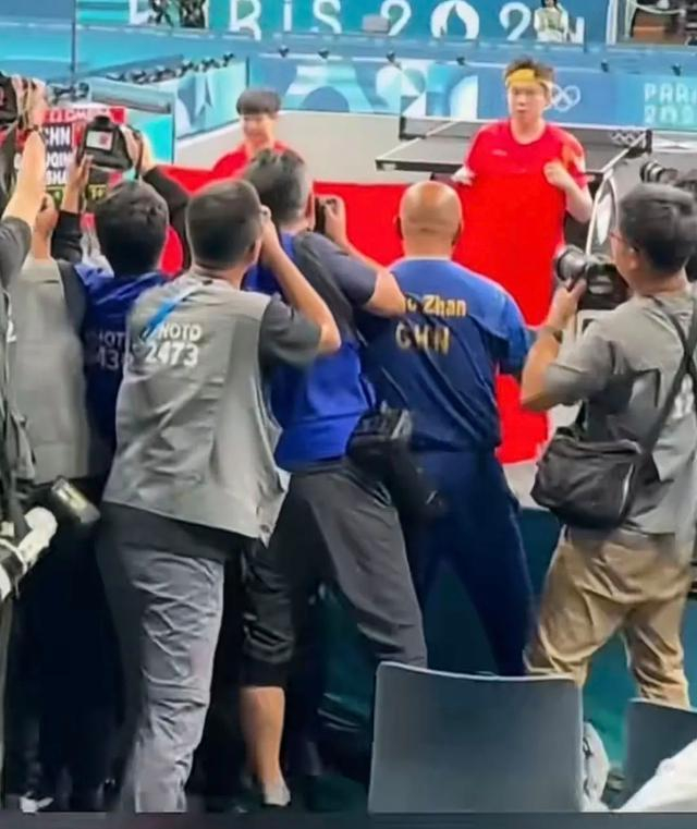 早前一天的乒乓球混双决赛,王楚钦的球拍被中国媒体记者不慎踩断,无疑为这个冷门带来了很多猜想——30日,王楚钦/孙颖莎以4比2的比分战胜朝鲜“神秘之师”组合李正植/金琴英,夺得奥运乒乓混双冠军。夺冠之后,中国“莎头组合”和教练一起展示国旗,引发包括多名中国记者在内的摄影师追拍,一度场面混乱。