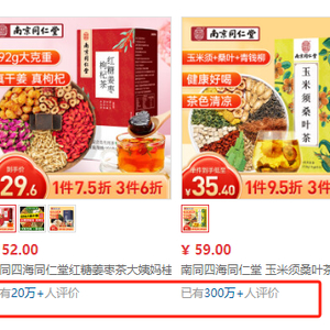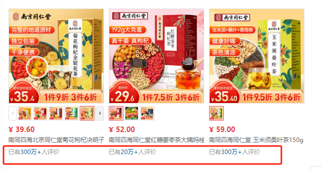 某电商平台上,一间“南同四海滋补养生旗舰店”售卖的标价39元的“南京同仁堂 红豆薏米茶”品类下,已有100万条售后反馈。另一间“南同四海自营旗舰店”售卖的单价39.6元的同仁堂“菊花枸杞决明子茶”和59元的“玉米须桑叶茶”售后反馈均已超过300万条。以此保守测算,南同四海的以上几个商品,在该电商平台的销售额合计已超过亿元。
