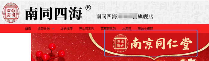 天眼查显示,申请“南同四海”商标的柴记商贸,与南京同仁堂、北京同仁堂,并无股权关系。而其网店的首页,“南同四海”的标识与“南京同仁堂”并列平行。事实上,仔细观察其售卖的产品,“南同四海”标识,与商品上南京同仁堂的“乐家老铺”商标,外观与背景花纹相同,仅中心的四个文字不同。