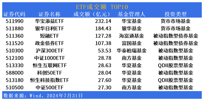 成交额方面,华宝添益ETF(511990)成交额达232亿元,银华日利ETF(511880)成交额达184.43亿元。两只债券ETF成交额再破百亿元。中证1000ETF(512100)成交额进入TOP10。