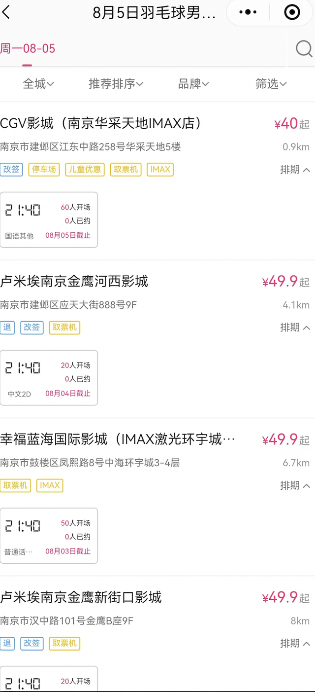 “8月3日,乒乓球女单铜牌赛+决赛·2024年巴黎奥运会赛事影院直播活动;20人起开场,南京5家影院可预约”……记者打开“淘票票”APP看到,“总台2024年巴黎奥运会电视节目影院直播预售开启”通道中,从7月31日到8月12日的多场比赛赛事都可以购票,不少场次已经20人满员了。