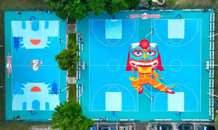 惠州体育馆室外篮球场将惠州的非物质文化遗产与地标建筑融入了球场之中,球场内充满色彩与生机。让人忍不住想去运动体验一番。惠州体育馆室外篮球场把篮球运动与惠州非物质文化遗产相结合,既传递了体育精神又彰显了传统文化。
