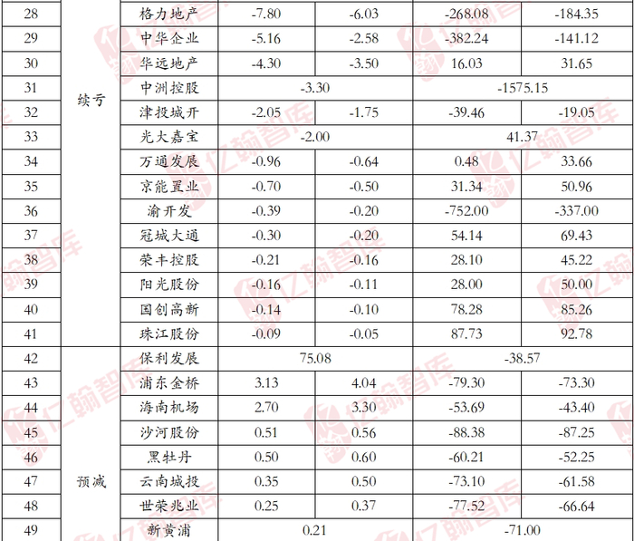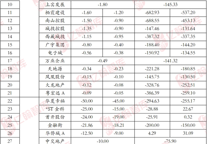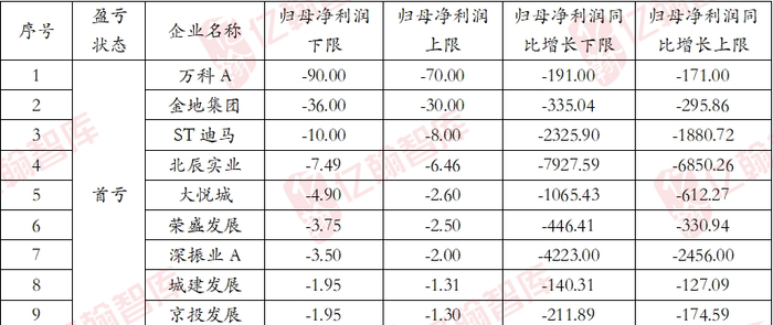 亏损的41家房企亏损总额在269-340亿元之间。其中,万科A为首预计亏损额度最高,归母净利润预计亏损70-90亿元。北辰实业预计归母净利润同比下滑幅度最大,下滑幅度高达6850.26%-7927.59%。