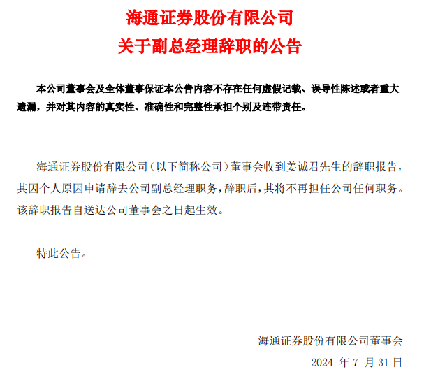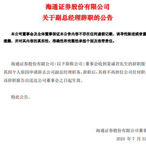 7月31日盘后,海通证券(600837.SH)公告,公司副总经理姜诚君因个人原因辞职。