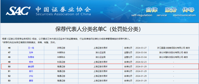 海通证券今年有12名保代进入保荐代表人分类名单C(处罚处分类)。其中,姜诚君在列。