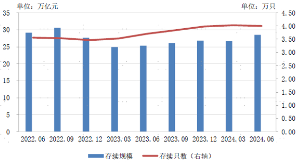 据2024年理财半年报披露,截至2024年6月末理财产品存续4万只,产品规模28.52万亿元,较2023年末抬升约6.43%,较2023年6月末同比增长12.55%。我们曾在报告《理财规模增长动能或下降》中曾估算2024年6月末存量理财规模约28.46万亿元,与理财年报披露数据相差仅约0.2%,吻合度较高。