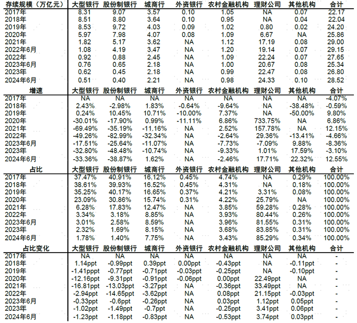 占比方面,截至2024年6月末,理财子公司规模占比最高,达到85.29%,较2023年末增长3.74个百分点;大型银行占比降至1.78%,较2023年末下降1.23个百分点;股份制银行占比较2023年末下降1.18个百分点,达1.4%,占比维持各银行机构中的末位;城商行的占比较2023年末下降0.83个百分点,为7.75%;农商行占比下降0.53个百分点至3.43%。