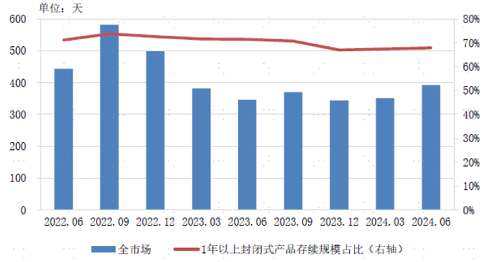 封闭式产品中,2024年1-6月新发封闭式产品加权平均期限在303-392天间(2023年平均期限在288-381天间)。存续产品中,1年以上产品余额占比较2023年末的67.02%略有抬升,截至2024年6月末达67.87%,较2023年末抬升0.85个百分点,较上年同期同比下降3.61个百分点。