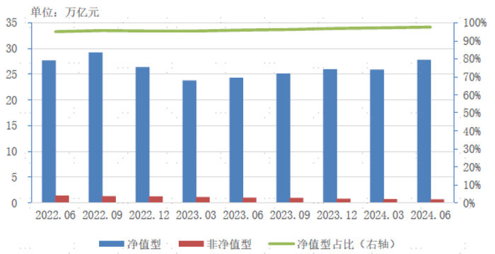 截至2024年6月末,净值型产品存续余额27.84万亿元,较2023年末抬升7. 2%。占比方面,同期末净值型产品占全部理财产品存续余额的97.61%,较2023年提高了0.68个百分点。