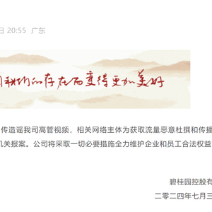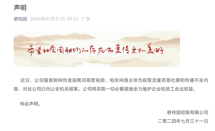 e公司讯,碧桂园微信公众号发布声明,近日,公司留意到网传造谣公司高管视频,相关网络主体为获取流量恶意杜撰和传播不实内容,对此公司已向公安机关报案。公司将采取一切必要措施全力维护企业和员工合法权益。