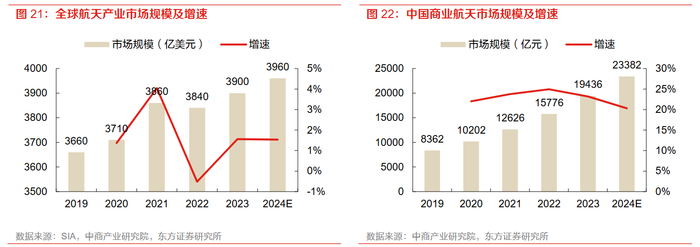 市场规模来看,中国市场方面,在政策和资本等多方加持下,2019-2023年中国商业航天产业保持着23%的年均复合增长率,显著高于全球增速。中商产业研究院数据显示,2020年中国商业航天市场规模已经突破1万亿元,到2023年规模接近2万亿元,预计2024年将达到2.3万亿元。