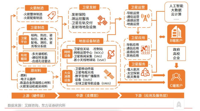 东方证券王天一等人6月12日研报指出,我国首个商业航天发射场——海南国际商业航天发射场正在建设中,中国商业航天全产业链已初步形成。商业航天产业链上游包括原材料、火箭制造和卫星制造;中游包含了卫星发射和地面设备制造;下游则主要是卫星的运营和服务,下游应用一般可以分为导航、通信和遥感应用,除此以外还有载人航天、太空探索和航天教育等新兴应用。
