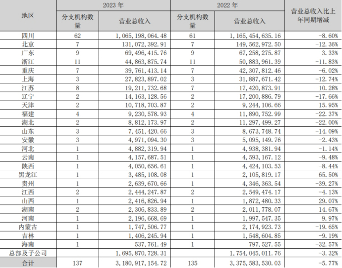 从地区划分来看,华西证券的分支机构主要存在于四川地区。除总部及子公司外,四川和北京两地的营收最高。在全部地区中,仅广东、江苏、天津、黑龙江、山西、湖南和河南七地在2023年的营收较2022年出现正增长,黑龙江65.50%的增长幅度最为明显。