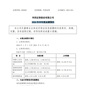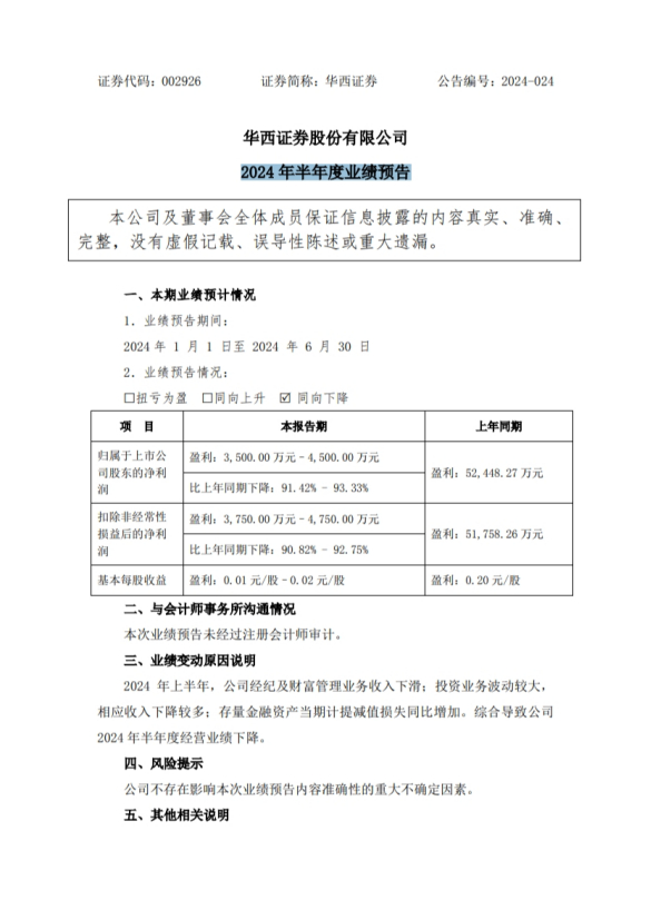 近日,华西证券发布2024年半年度业绩预告,对其业绩做出了“负面”的预报。