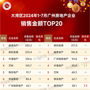 大湾区2024年1-7月广州房地产企业销售业绩排行榜