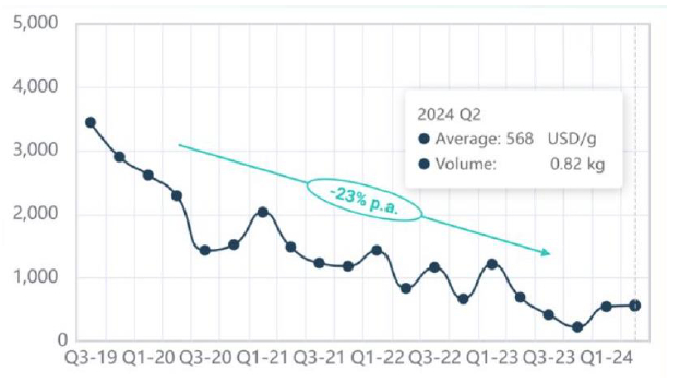 根据QYOBO数据,2024Q2司美格鲁肽原料中间体为568美元/克,2024年至今保持稳定。以此为基础,我们预计目前GMP级别原料药中间体价格维持在约4000元/克。根据CNBC研究数据,司美格鲁肽Ozempic一个月用量生产成本约为4.73美元,我们测算约对应3,700元/克。虽然相比2019年高点下跌较多,但仍旧维持较高的绝对价格。