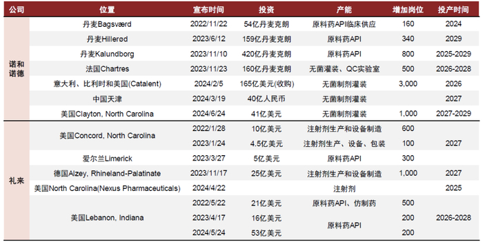 海外MNC产能2026-2027年开始规模化释放。伴随司美格鲁肽和替尔泊肽供不应求,原研厂商诺和诺德和礼来加大了产能投资和收购力度,2022年至今合计斥资分别约330亿美元和134亿美元,包括原料药、无菌灌装、注射剂生产等环节均有较多处产能在建。从公司公开披露计划计算,我们判断大批量产能从2025年开始投入使用,高峰投放时期为2026-2027年。
